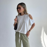חולצה מבד מודל רך עם פתח עדין בכתף אחת , נשפכת, מחמיאה ומוסיפה טאץ’ אלגנטי ללוק יומיומי או ערב קליל.