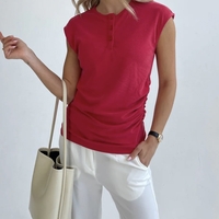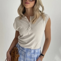 חולצה נשית בגזרה נינוחה, עשויה בד וופל קליל ונעים, מפתח עם כפתורים וכיווץ בצד למראה קז’ואל אלגנטי. מתאימה ליום יום.